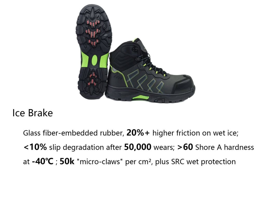 Glass fiber-reinforced safety shoes: 20%+ wet ice friction boost, 50,000+ flex durability-40℃ resistance,10,000+ micro-cleats/cm?, and EU SRC anti-slip certification.Al-around protection for winter industria work!