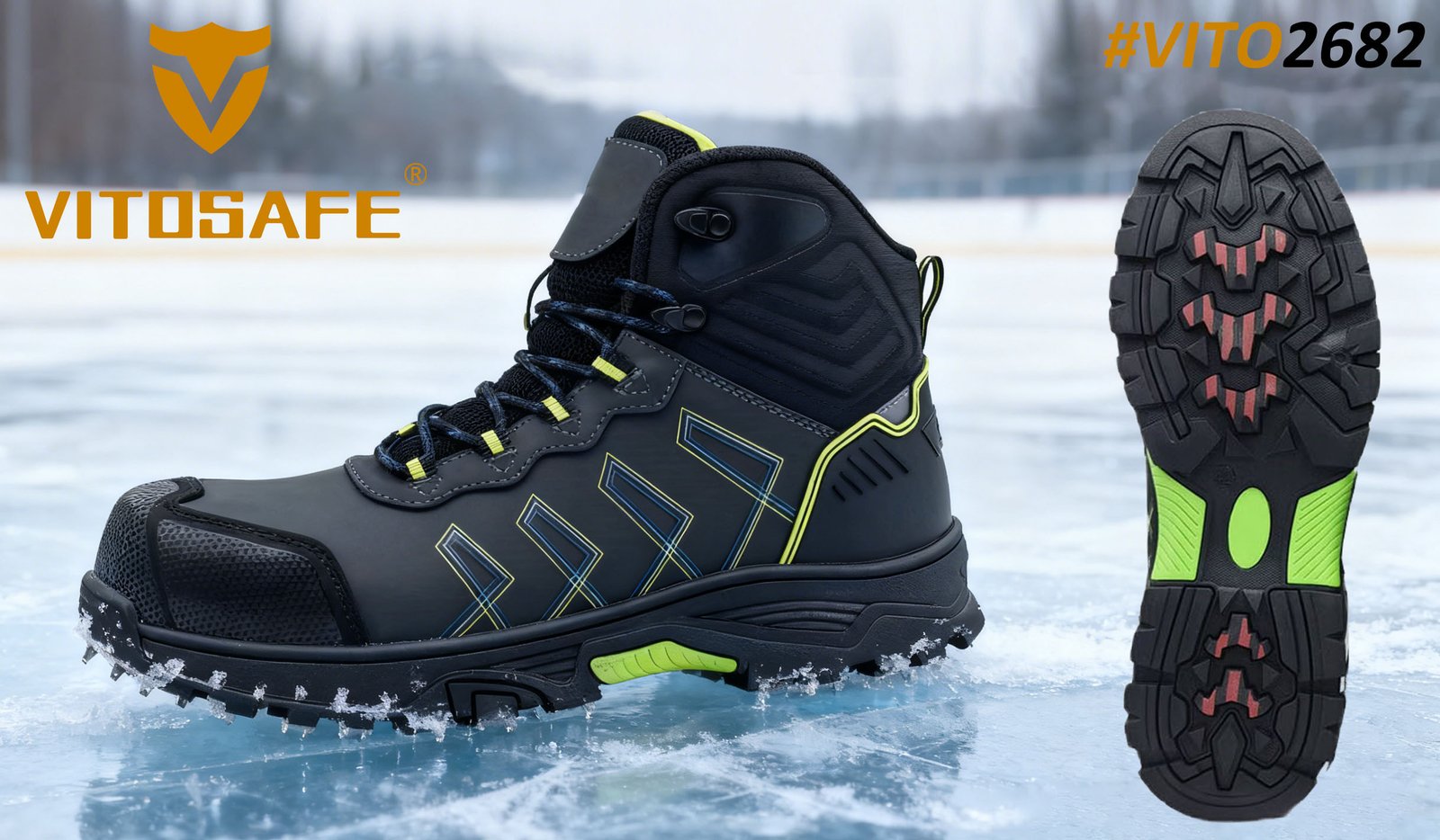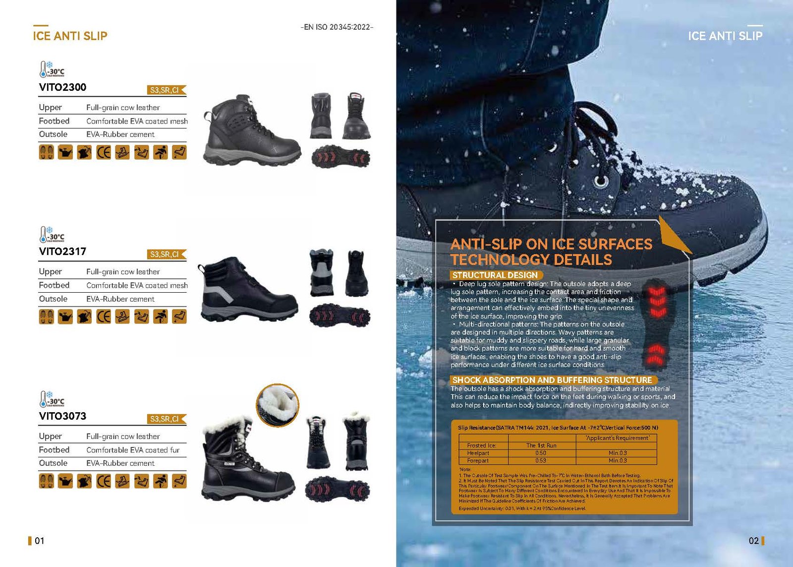 Glass fiber-reinforced safety shoes: 20%+ wet ice friction boost, 50,000+ flex durability-40℃ resistance,10,000+ micro-cleats/cm?, and EU SRC anti-slip certification.Al-around protection for winter industria work!