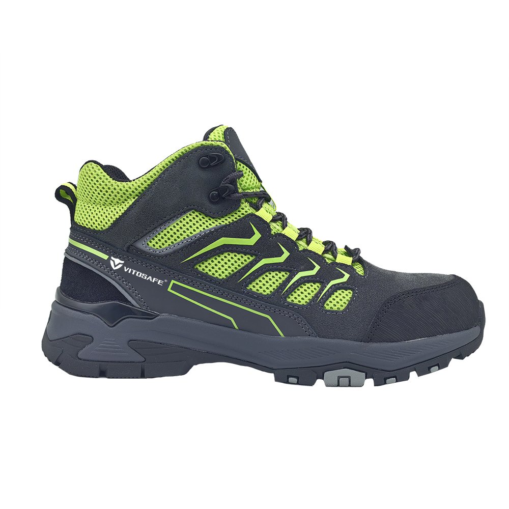 This work wear safety shoes is a mid cut style made of Suede cow leather+sandwich mesh, which is anti smashing, anti puncture, comfortable, and has a non slip and wear-resistant outsole.